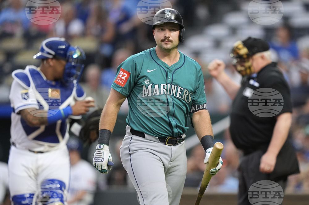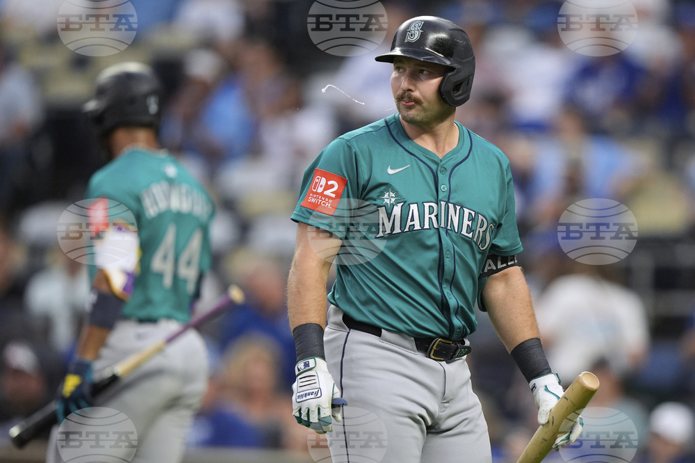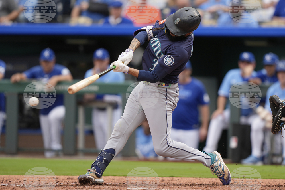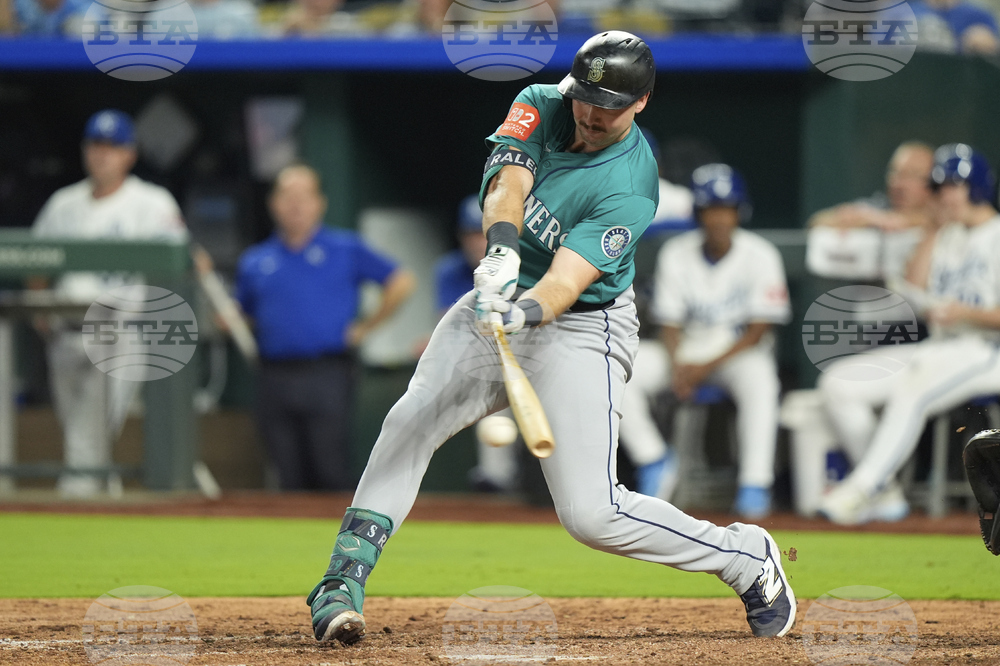 Seattle Mariners' J.P. Crawford hits an RBI double during the eighth inning of a baseball game against the Kansas City Royals, Thursday, Sept. 18, 2025, in Kansas City, Mo. (AP Photo/Charlie Riedel)
