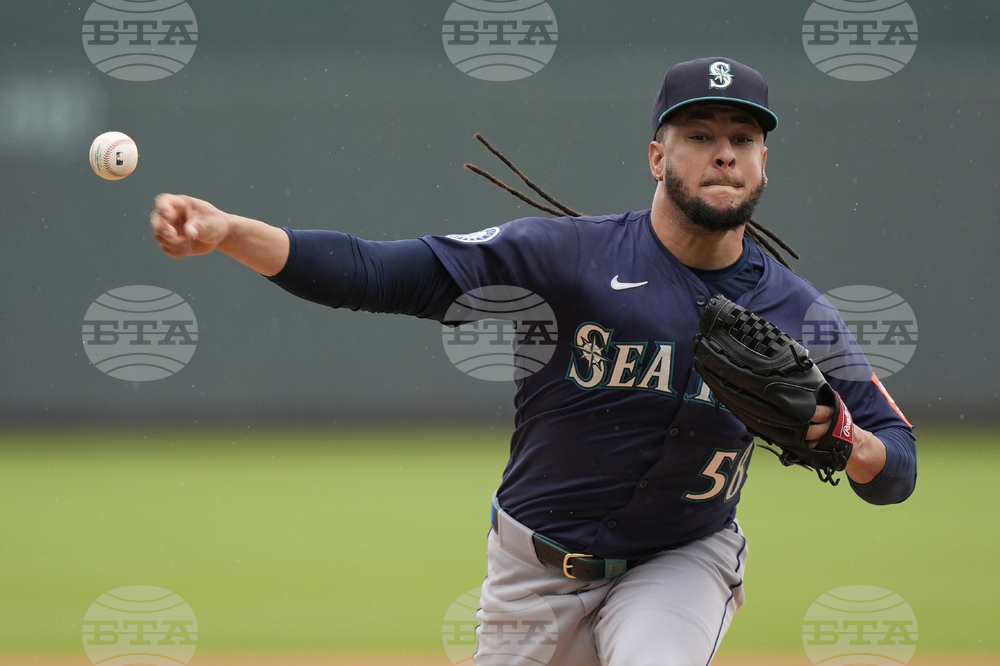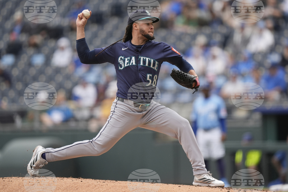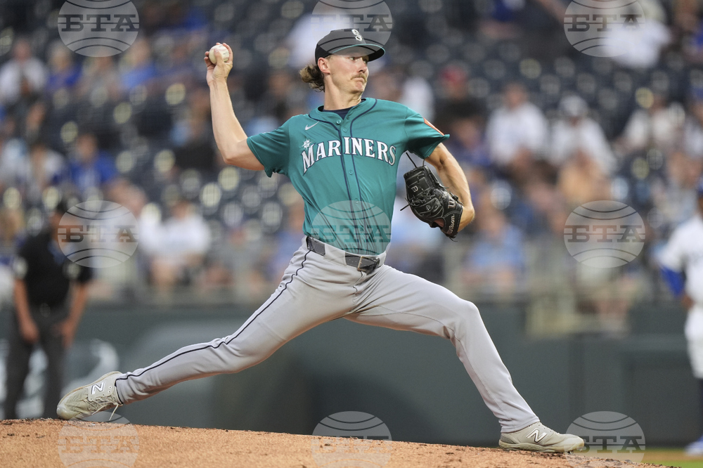 Seattle Mariners starting pitcher Bryce Miller throws during the first inning of a baseball game against the Kansas City Royals, Wednesday, Sept. 17, 2025, in Kansas City, Mo. (AP Photo/Charlie Riedel)