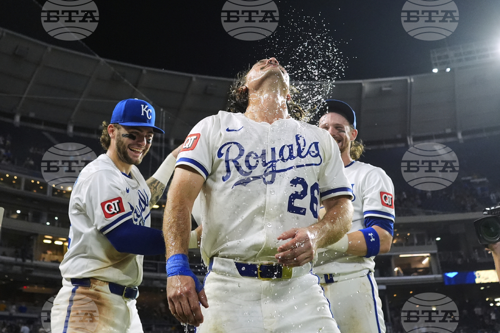 Kansas City Royals' Adam Frazier (26) is doused by teammates after a baseball game against the Seattle Mariners, Wednesday, Sept. 17, 2025, in Kansas City, Mo. (AP Photo/Charlie Riedel)