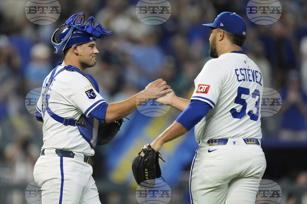 Kansas City Royals relief pitcher Carlos Estevez celebrates after a baseball game against the Seattle Mariners, Wednesday, Sept. 17, 2025, in Kansas City, Mo. (AP Photo/Charlie Riedel)