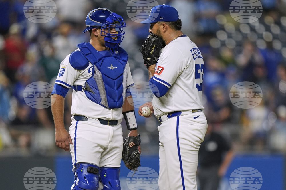 Kansas City Royals relief pitcher Carlos Estevez throws during the ninth inning of a baseball game against the Seattle Mariners, Wednesday, Sept. 17, 2025, in Kansas City, Mo. (AP Photo/Charlie Riedel)
