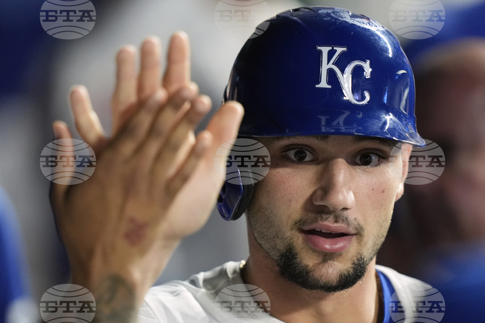 Kansas City Royals' Jac Caglianone celebrates in he dugout after scoring on a single by Carter Jensen during the eighth inning of a baseball game against the Seattle Mariners, Wednesday, Sept. 17, 2025, in Kansas City, Mo. (AP Photo/Charlie Riedel)