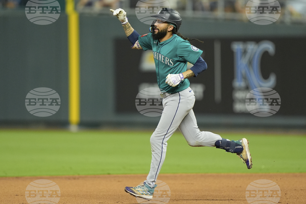Seattle Mariners' J.P. Crawford celebrates as he runs the bases after hitting a solo home run during the eighth inning of a baseball game against the Kansas City Royals, Wednesday, Sept. 17, 2025, in Kansas City, Mo. (AP Photo/Charlie Riedel)