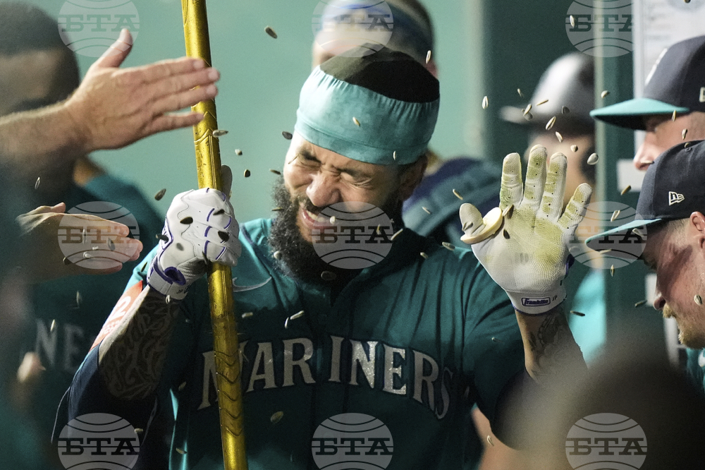 Seattle Mariners' J.P. Crawford (3) and Julio Rodriguez (44) celebrate after their baseball game against the Kansas City Royals, Thursday, Sept. 18, 2025, in Kansas City, Mo. (AP Photo/Charlie Riedel)