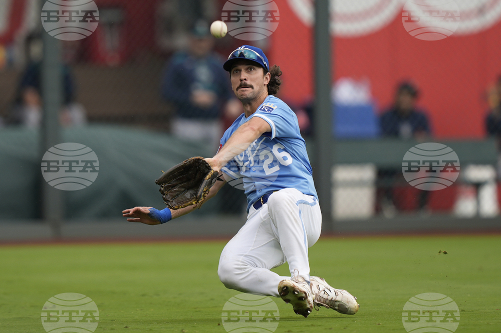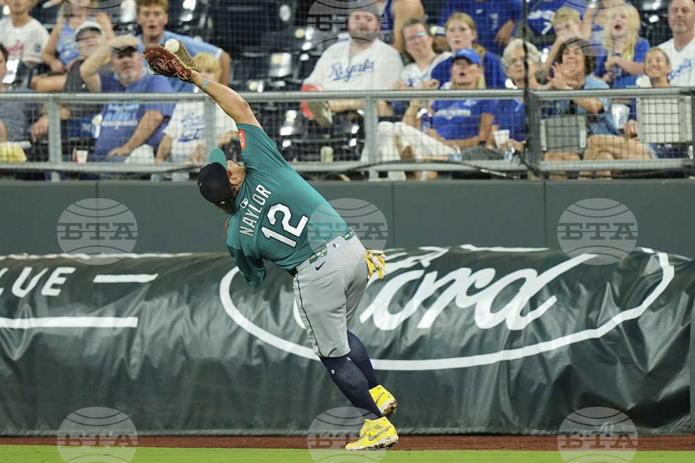 Seattle Mariners center fielder Julio Rodriguez catches a fly ball for the out on Kansas City Royals' Mike Yastrzemski during the third inning of a baseball game Thursday, Sept. 18, 2025, in Kansas City, Mo. (AP Photo/Charlie Riedel)