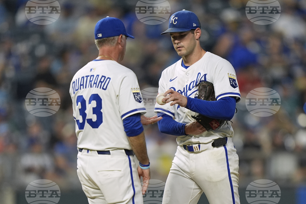 Kansas City Royals manager Matt Quatraro (33) takes the ball from starting pitcher Cole Ragans as he makes a pitching change during the fourth inning of a baseball game against the Seattle Mariners, Wednesday, Sept. 17, 2025, in Kansas City, Mo. (AP Photo/Charlie Riedel)