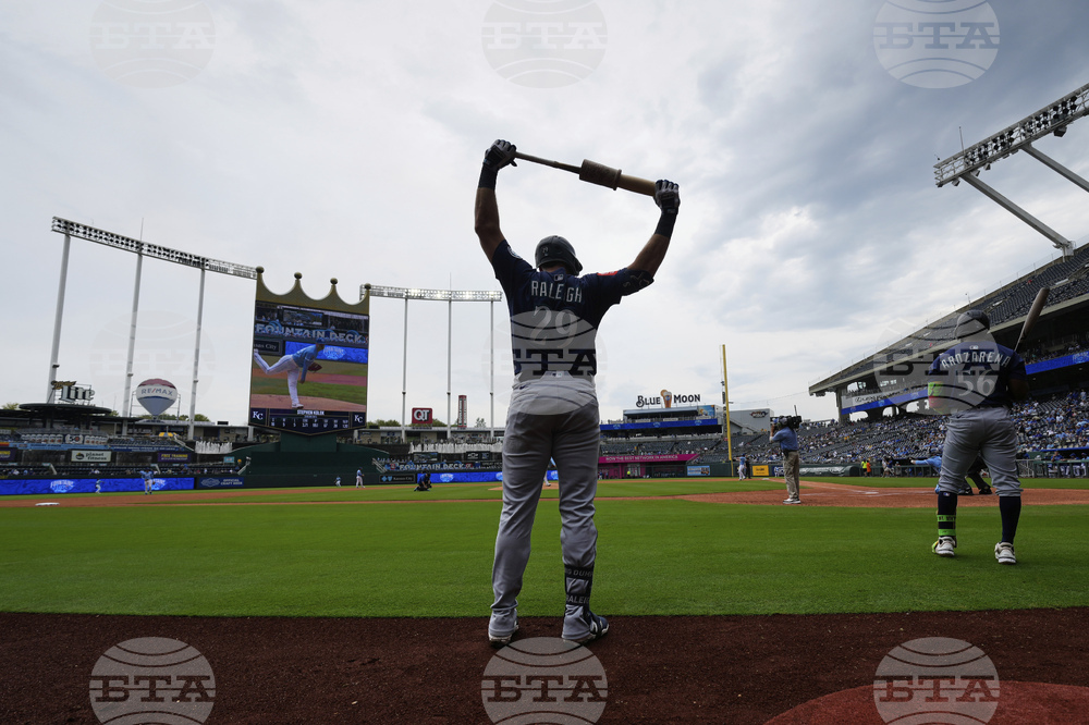 Seattle Mariners' Cal Raleigh (29) stretches on deck before a baseball game against the Kansas City Royals, Thursday, Sept. 18, 2025, in Kansas City, Mo. (AP Photo/Charlie Riedel)