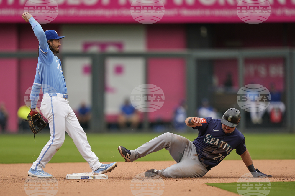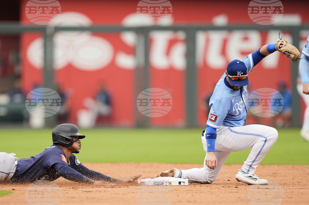 Seattle Mariners' Jorge Polanco, left, is caught off base at second by Kansas City Royals second baseman Michael Massey to get the second out of a double play hit into by Dominic Canzone during the second inning of a baseball game, Thursday, Sept. 18, 2025, in Kansas City, Mo. (AP Photo/Charlie Riedel)