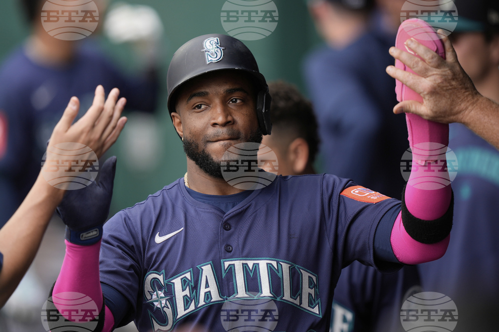 Seattle Mariners' Victor Robles celebrates in the dugout after scoring on a double by J.P. Crawford during the eighth inning of a baseball game against the Kansas City Royals, Thursday, Sept. 18, 2025, in Kansas City, Mo. (AP Photo/Charlie Riedel)