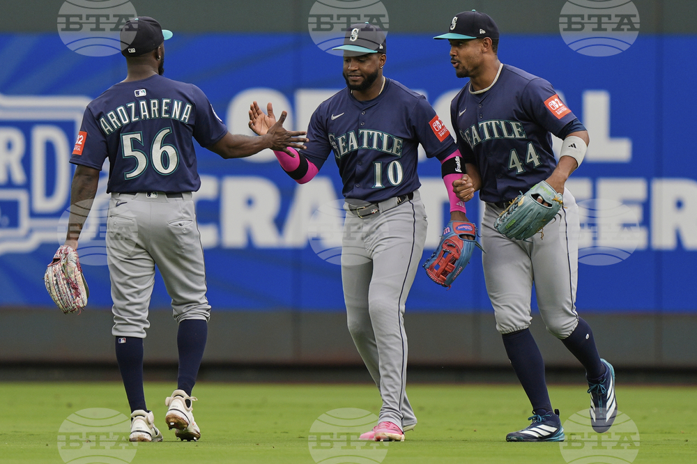 Seattle Mariners outfielders Randy Arozarena (56), Victor Robles (10) and Julio Rodriguez (44) celebrate after their baseball game against the Kansas City Royals, Thursday, Sept. 18, 2025, in Kansas City, Mo. (AP Photo/Charlie Riedel)