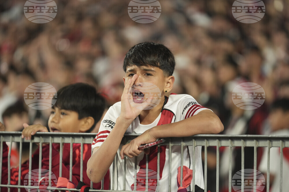 A fan of Argentina's River Plate waits for the start of a Copa Libertadores quarterfinal soccer match Brazil's Palmeiras at the Monumental stadium in Buenos Aires, Argentina, Wednesday, Sept. 17, 2025. (AP Photo/Gustavo Garello)