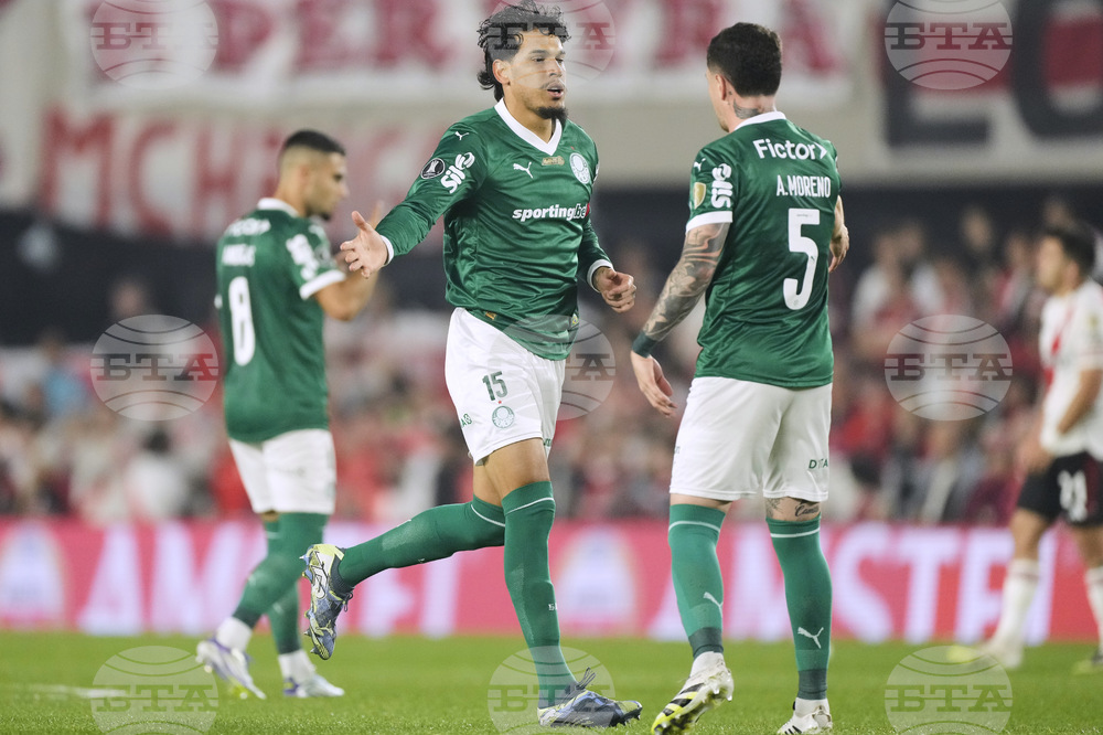 Gustavo Gomez, left, of Brazil's Palmeiras celebrates scoring his side's first goal against Argentina's River Plate during a Copa Libertadores quarterfinal soccer match at the Monumental stadium in Buenos Aires, Argentina, Wednesday, Sept. 17, 2025. (AP Photo/Gustavo Garello)