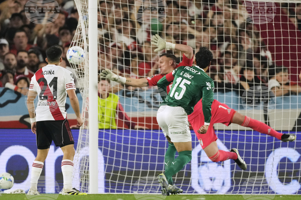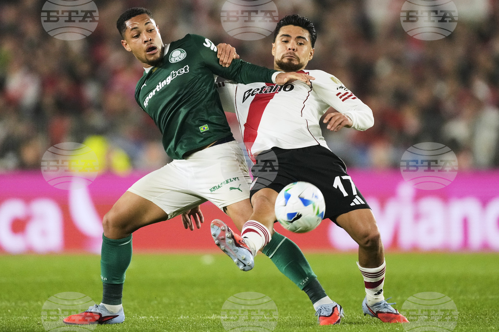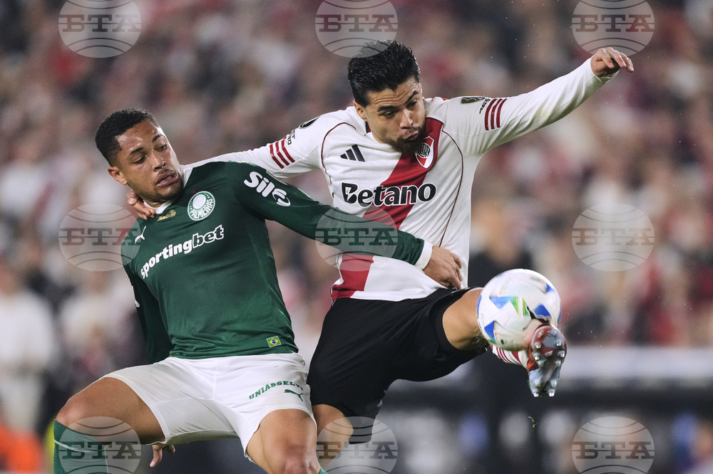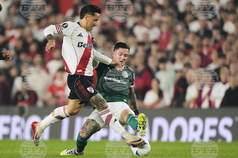 Sebastian Driussi of Argentina's River Plate, left, and Anibal Moreno of Brazil's Palmeiras battle for the ball during a Copa Libertadores quarterfinal soccer match at the Monumental stadium in Buenos Aires, Argentina, Wednesday, Sept. 17, 2025. (AP Photo/Gustavo Garello)