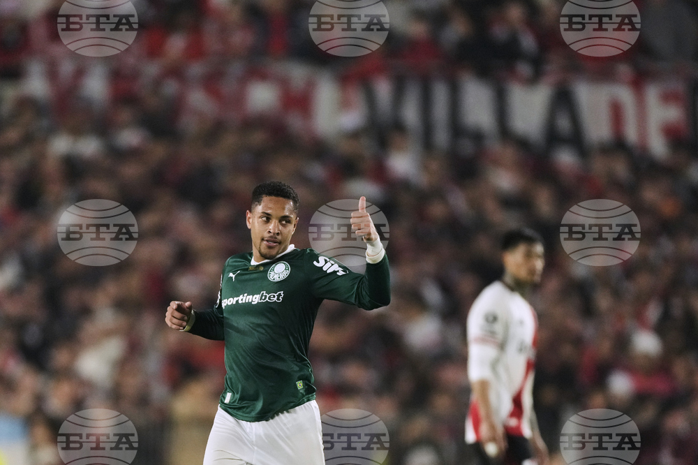 Vitor Roque of Brazil's Palmeiras celebrates scoring his side's second goal against Argentina's River Plate during a Copa Libertadores quarterfinal soccer match at the Monumental stadium in Buenos Aires, Argentina, Wednesday, Sept. 17, 2025. (AP Photo/Gustavo Garello)