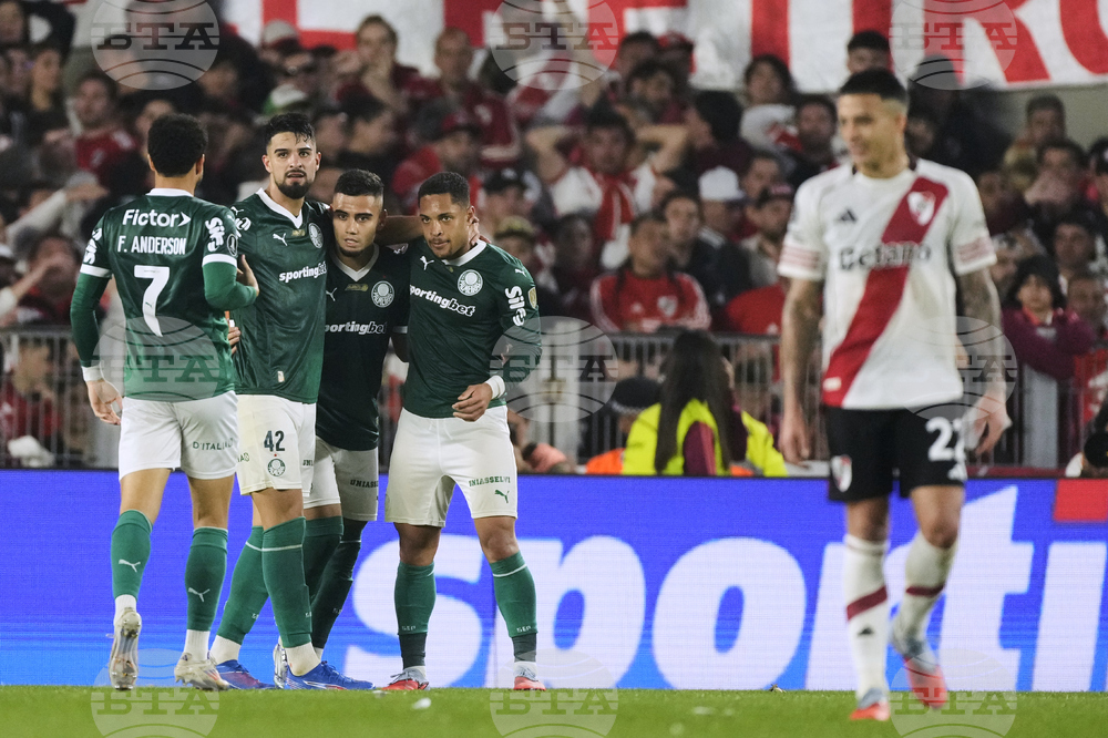 Vitor Roque of Brazil's Palmeiras, left, and Paulo Diaz of Argentina's River Plate battle for the ball during a Copa Libertadores quarterfinal soccer match at the Monumental stadium in Buenos Aires, Argentina, Wednesday, Sept. 17, 2025. (AP Photo/Gustavo Garello)