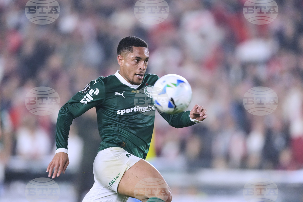Vitor Roque of Brazil's Palmeiras views the ball during a Copa Libertadores quarterfinal soccer match against Argentina's River Plate at the Monumental stadium in Buenos Aires, Argentina, Wednesday, Sept. 17, 2025. (AP Photo/Gustavo Garello)