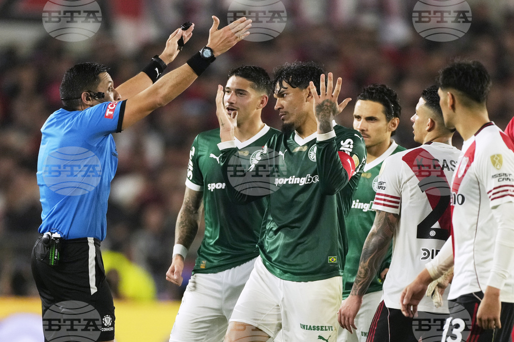Referee Jesus Valenzuela reacts during a Copa Libertadores quarterfinal soccer match between Brazil's Palmeiras and Argentina's River Plate at the Monumental stadium in Buenos Aires, Argentina, Wednesday, Sept. 17, 2025. (AP Photo/Gustavo Garello)