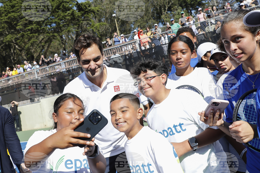 Roger Federer, Swiss former tennis player, poses for photos with young tennis players from Youth Tennis Advantage, East Palo Alto Tennis and Tutoring, and San Francisco Recreation and Park Department's Tennis & Learning Center after they played tennis on the renovated and repaved courts at John McLaren Park Tennis Courts on Tuesday, September 16, 2025 in San Francisco. (Lea Suzuki/San Francisco Chronicle via AP)
