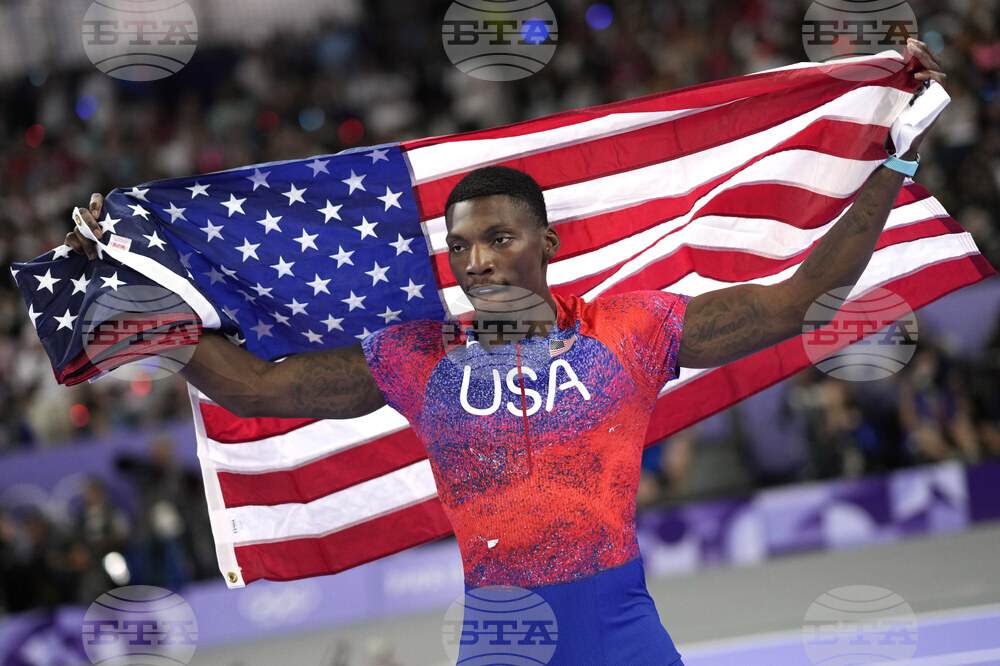 FILE - Fred Kerley, of the United States, celebrates after his third place finish in the men's 100-meter final at the 2024 Summer Olympics, on Aug. 4, 2024, in Saint-Denis, France. (AP Photo/Bernat Armangue, File)