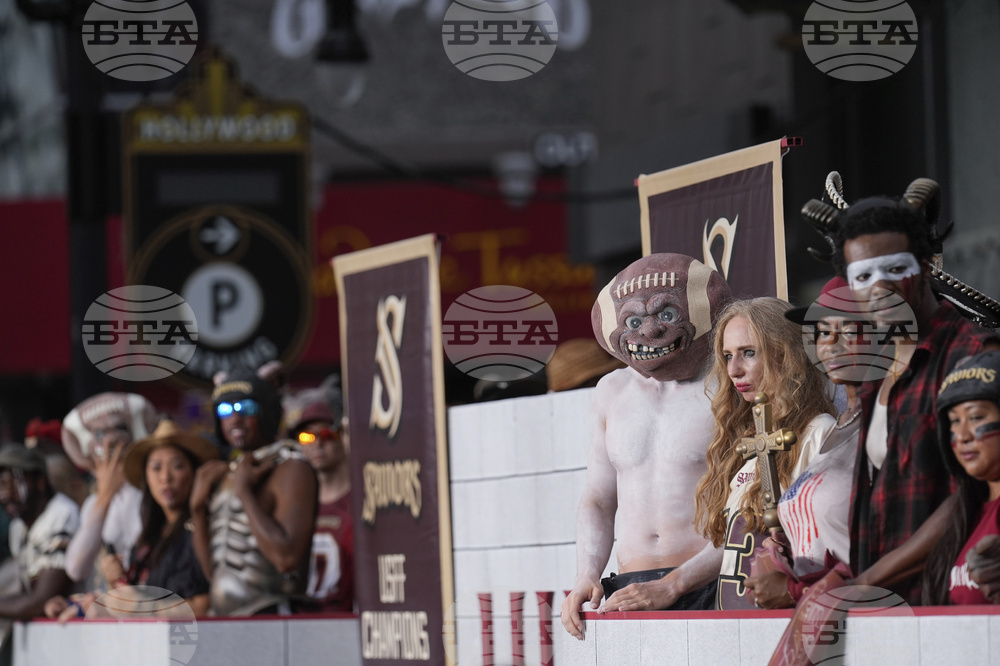 Costumed football fan characters promote the premiere of "Him" on Wednesday, Sept. 17, 2025, at TCL Chinese Theatre in Los Angeles. (AP Photo/Chris Pizzello)
