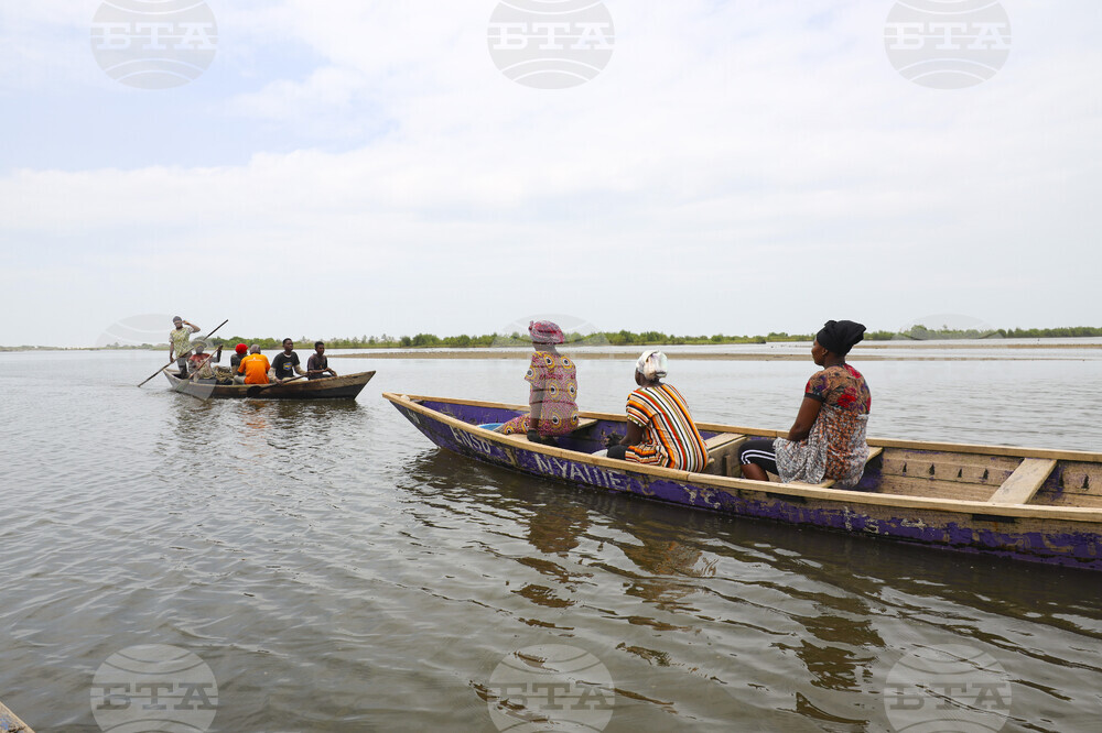 Women leave on boats to harvest oysters at Tsokomey, Ghana, Aug. 6, 2025. (AP Photo/Misper Apawu)