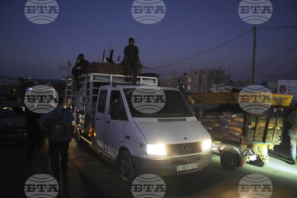 Members of the Abu Jarad family unload their belongings from a truck in Khan Younis, Gaza Strip, Sept. 10, 2025, after fleeing Gaza City following evacuation orders issued by the Israeli army. (AP Photo/Abdel Kareem Hana)