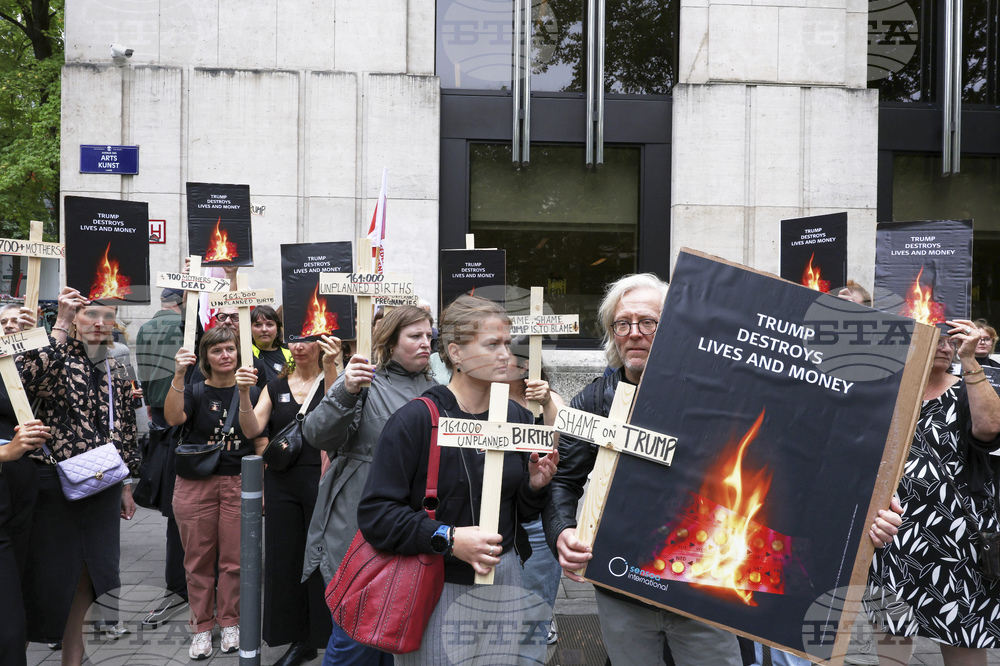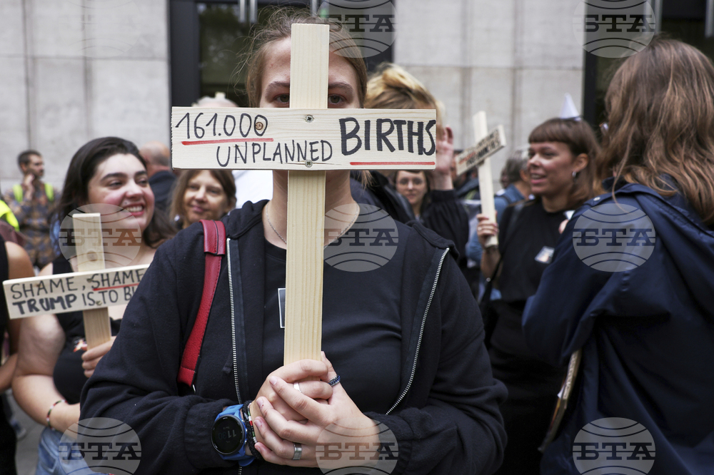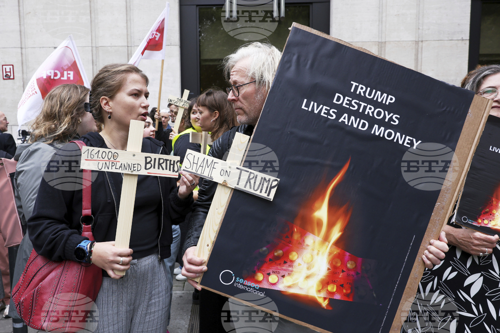Participants from various women's rights organizations hold signs as they demonstrate regarding the destruction of family planning supplies stockpiled in Belgium, near the U.S. embassy in Brussels, Thursday, Sept. 18, 2025. (AP Photo/Omar Havana)