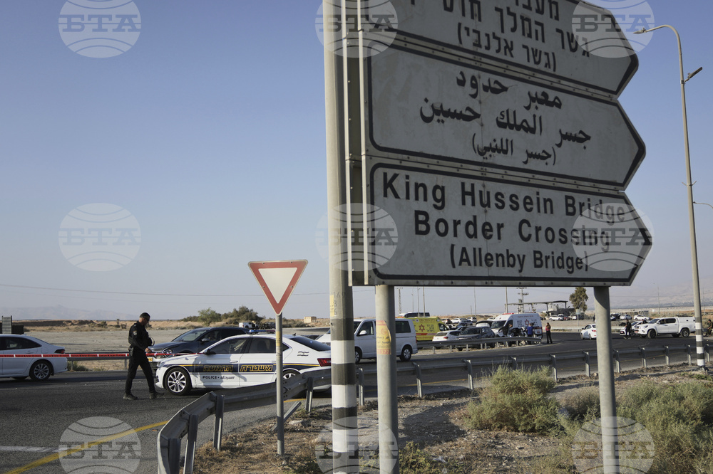 Israeli police stand guard near the site of a shooting attack where Israeli officials say two people were shot and killed in a militant attack at the Allenby Bridge Crossing between the West Bank and Jordan, Thursday, Sept. 18, 2025. (AP Photo/Mahmoud Illean)