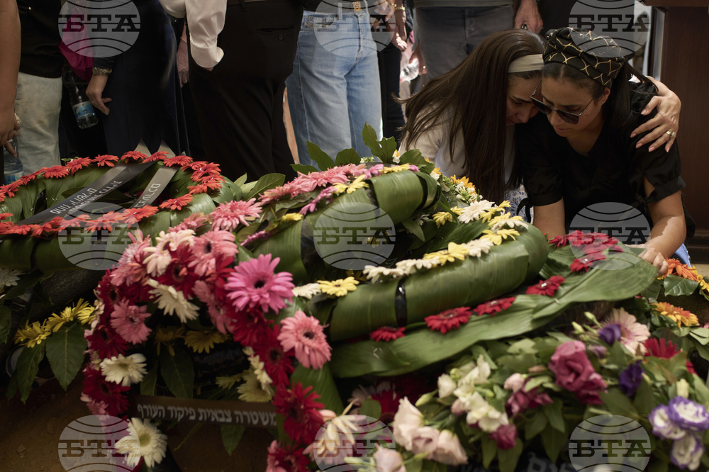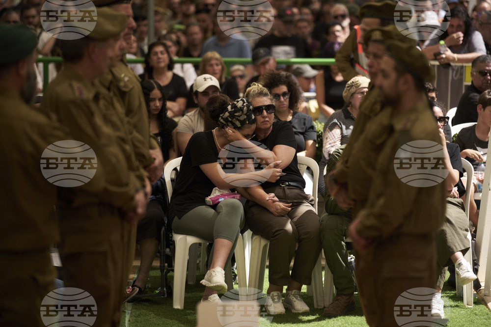 Michal, right, comforts her daughter Rout during the funeral of her husband, Lieutenant Colonel Yitzhak Haresh, who was killed in a shooting attack yesterday at the Allenby Bridge Crossing between the West Bank and Jordan, at the Mount Herzl military cemetery in Jerusalem, Friday, Sept. 19, 2025. (AP Photo/Leo Correa)