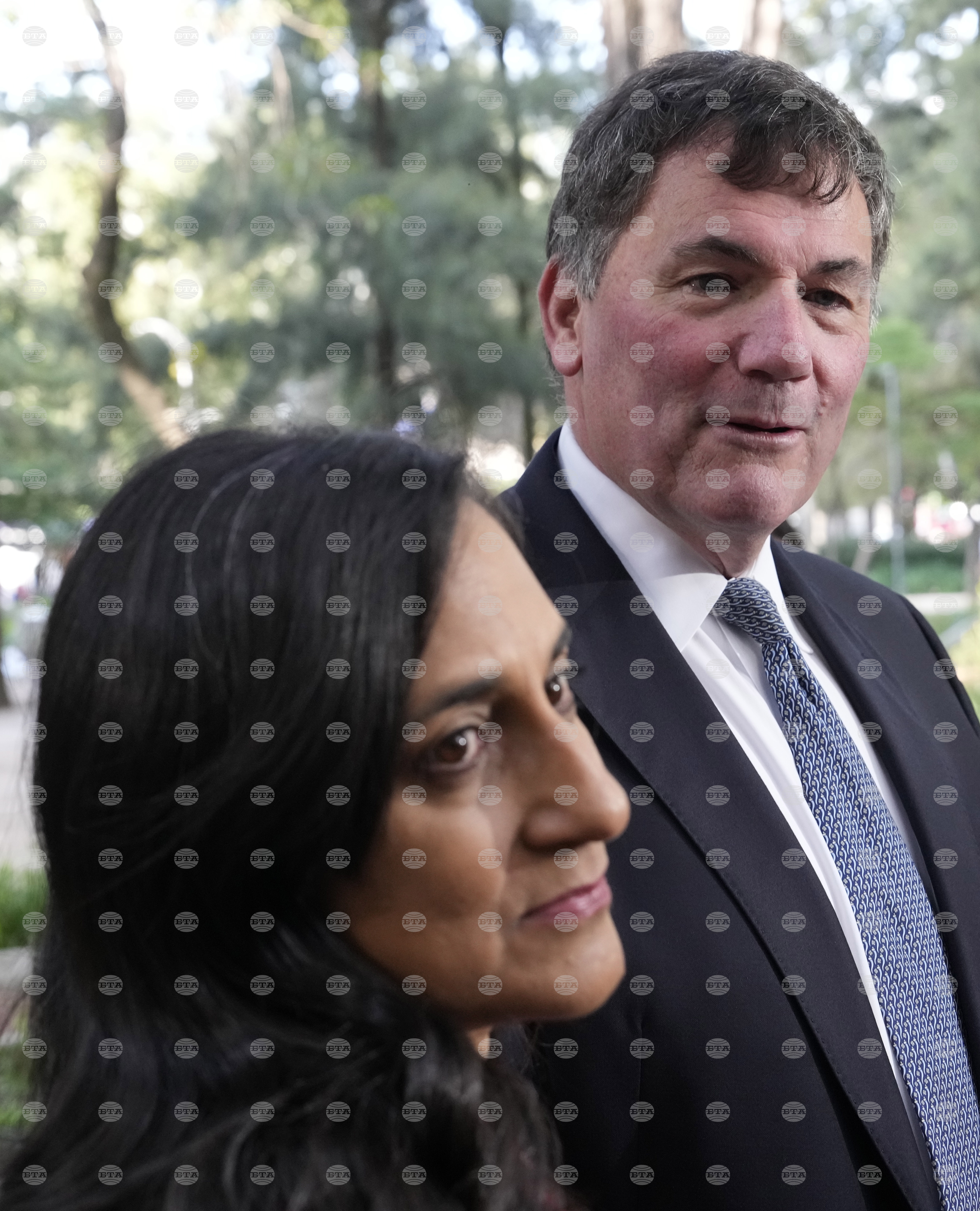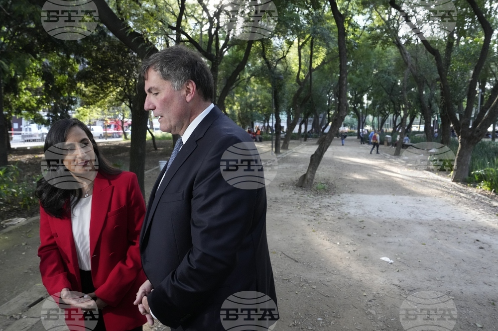 Foreign Affairs Minister Anita Anand and King's Privy Council President and Canada-U.S. Trade Minister Dominic LeBlanc speak with the media in a park in Mexico City, Friday Sept.19, 2025. (Adrian Wyld /The Canadian Press via AP)