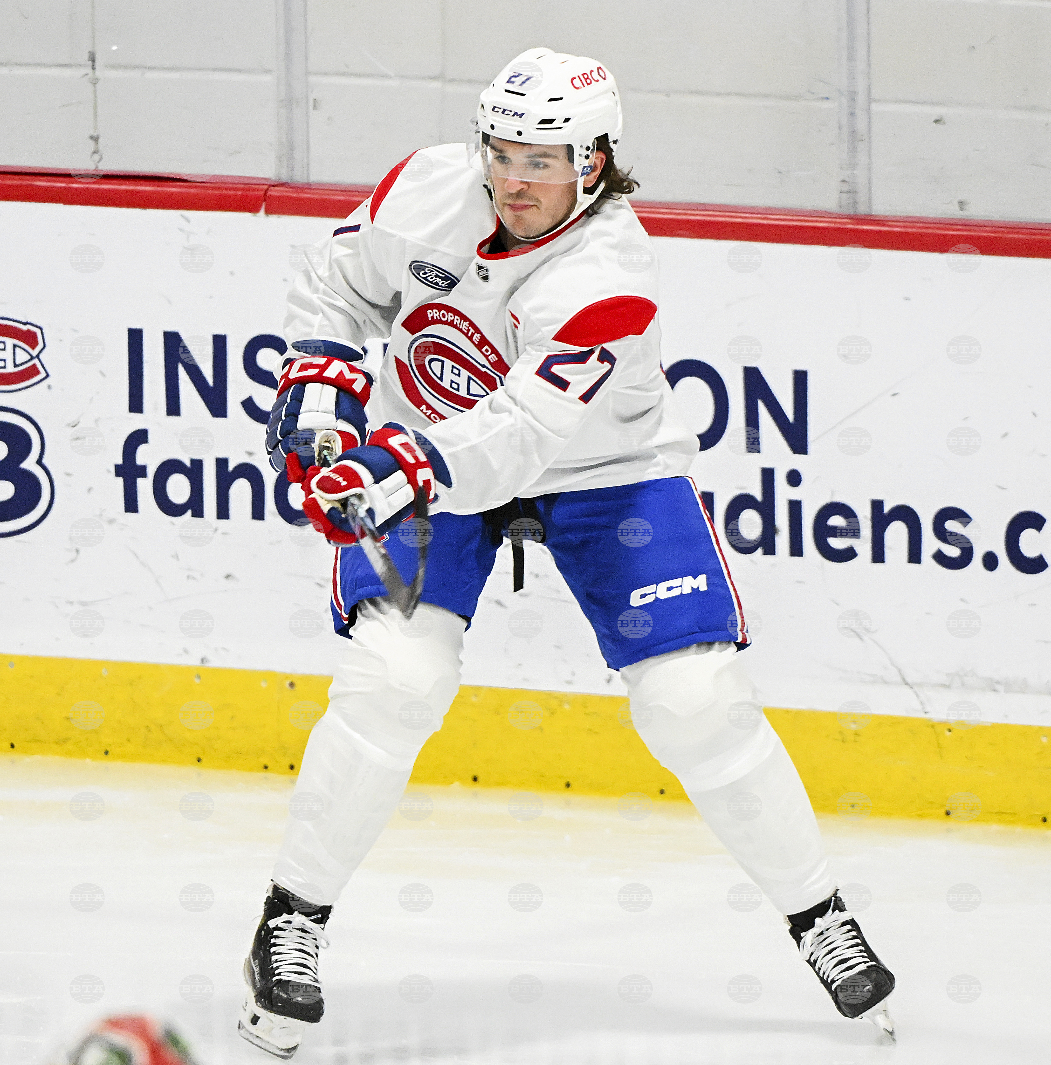 Montreal Canadiens' Samuel Blais (27) plays a pass during NHL hockey training camp in Brossard, Quebec, Thursday, Sept. 18, 2025. (Graham Hughes/The Canadian Press via AP)