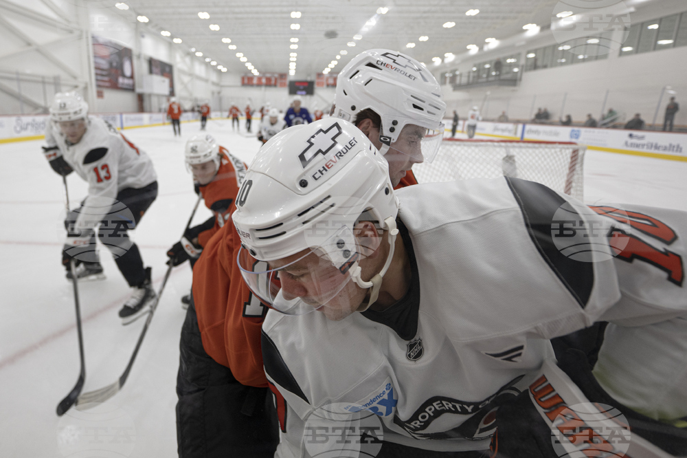 Flyers players, from left, Adam Ginning (13), Alexis Gendron (92), Jett Luchanko (17), and Bobby Brink (10) battle for the puck along the boards during NHL hockey training camp at the Flyers Training Center in Voorhees, N.J., Thursday, Sept. 18, 2025.(Jose F. Moreno/The Philadelphia Inquirer via AP)