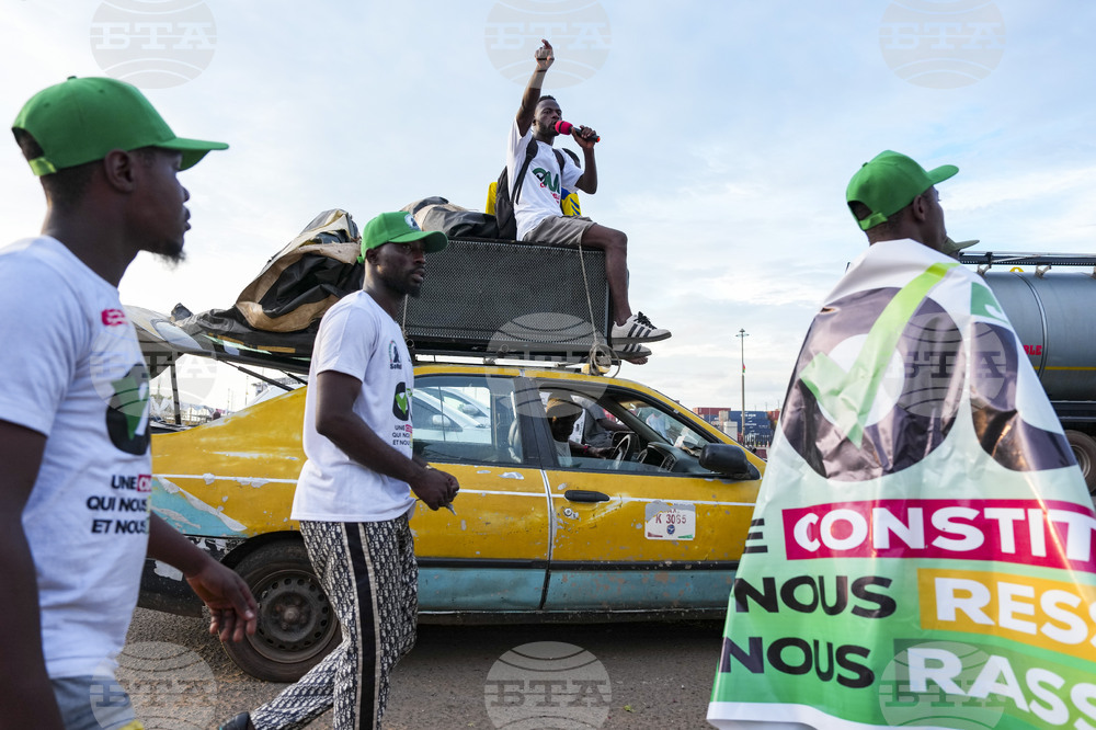 Supporters ride on top of a taxi as they conclude campaign activities ahead of the constitutional referendum in Conakry, Guinea, Thursday, Sept. 18, 2025. (AP Photo/Misper Apawu)