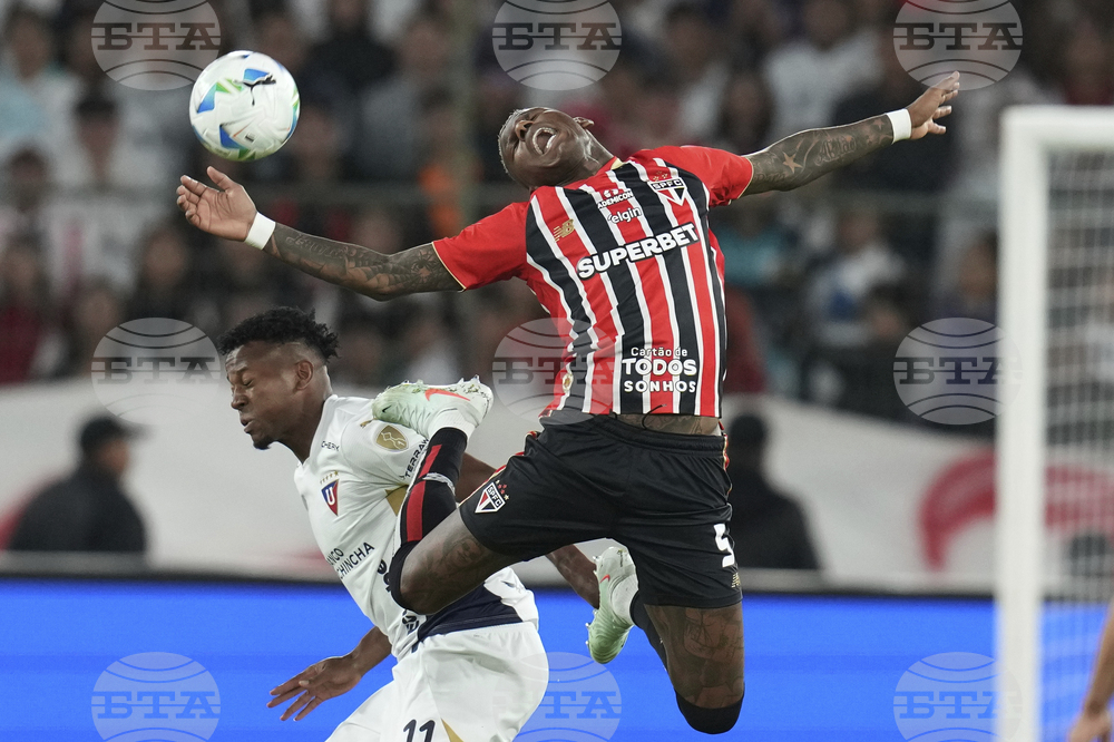 Robert Arboleda of Brazil's Sao Paulo, right, and Michael Estrada of Ecuador's Liga Deportiva Universitaria battle for the ball during a Copa Libertadores quarterfinal first leg soccer match at Rodrigo Paz Delgado stadium in Quito, Ecuador, Thursday, Sept. 18, 2025. (AP Photo/Dolores Ochoa)