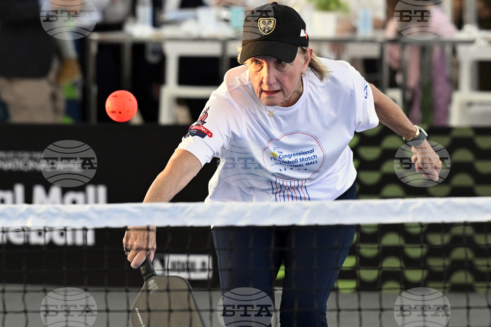 Sen. Bernie Moreno, R-Ohio, left, and Sen. Shelley Moore Capito, R-W.Va., participate in a Congressional Pickleball Match held on the National Mall on Thursday, Sept. 18, 2025, in Washington. (AP Photo/John McDonnell)