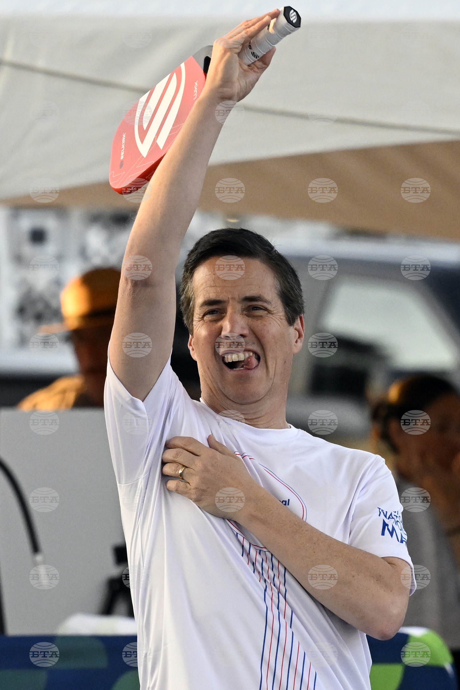 Sen. Bernie Moreno, R-Ohio celebrates a point during a Congressional Pickleball Match held on the National Mall on Thursday, Sept.18, 2025, in Washington. (AP Photo/John McDonnell)