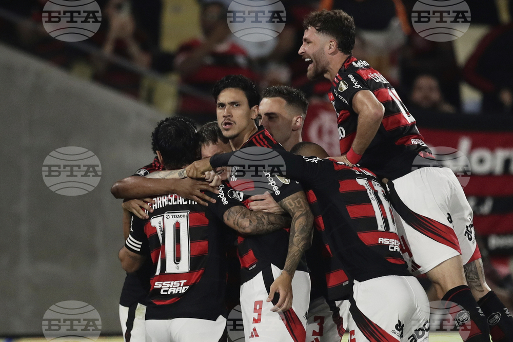 Pedro of Brazil's Flamengo, center, celebrates with teammates after scoring his side's opening goal against Argentina's Estudiantes de La Plata during a Copa Libertadores quarterfinal soccer match at Maracana stadium, in Rio de Janeiro, Thursday, Sept. 18, 2025. (AP Photo/Bruna Prado)