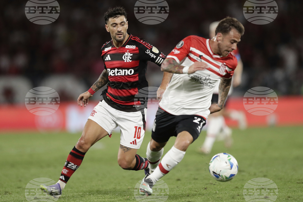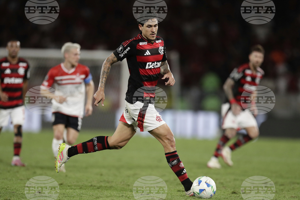 Pedro of Brazil's Flamengo controls the ball during a Copa Libertadores quarterfinal soccer match against Argentina's Estudiantes de La Plata at Maracana stadium, in Rio de Janeiro, Thursday, Sept. 18, 2025. (AP Photo/Bruna Prado)
