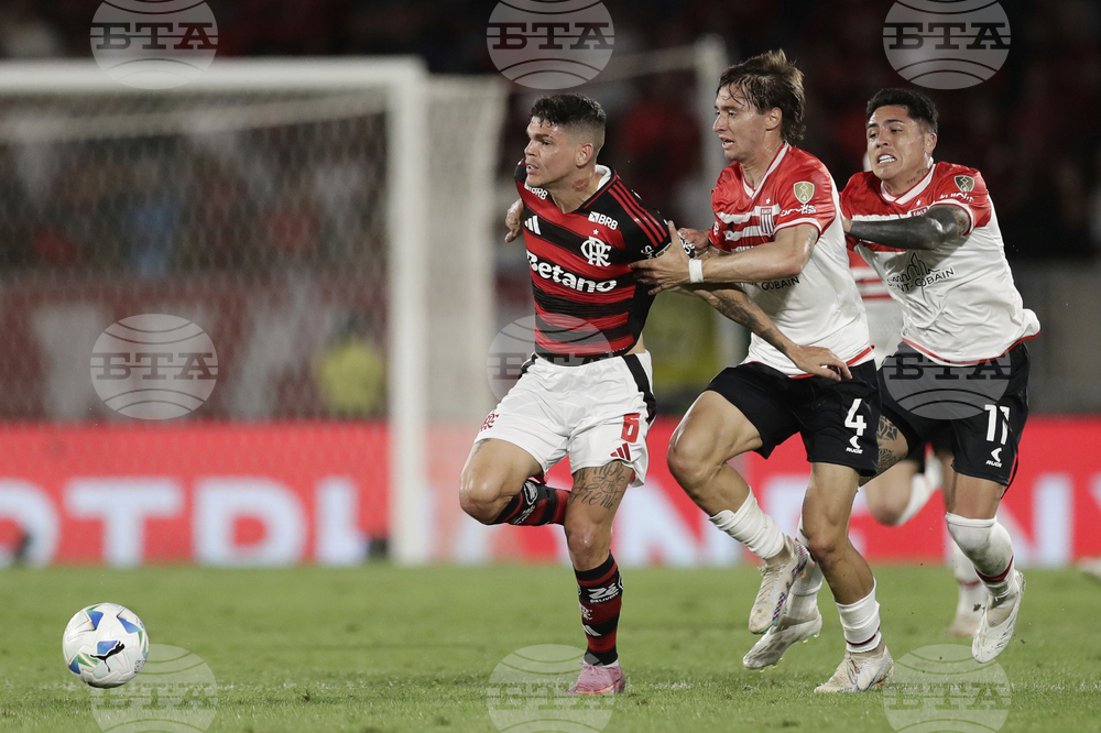 Mikel Amondarain of Argentina's Estudiantes de La Plata, center, and Nicolas de la Cruz of Brazil's Flamengo battle for the ball during a Copa Libertadores quarterfinal soccer match at Maracana stadium, in Rio de Janeiro, Thursday, Sept. 18, 2025. (AP Photo/Bruna Prado)