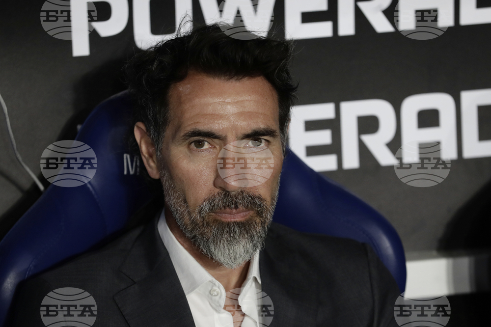 Coach Eduardo Dominguez of Argentina's Estudiantes de La Plata looks on prior to a Copa Libertadores quarterfinal soccer match against Brazil's Flamengo at Maracana stadium, in Rio de Janeiro, Thursday, Sept. 18, 2025. (AP Photo/Bruna Prado)