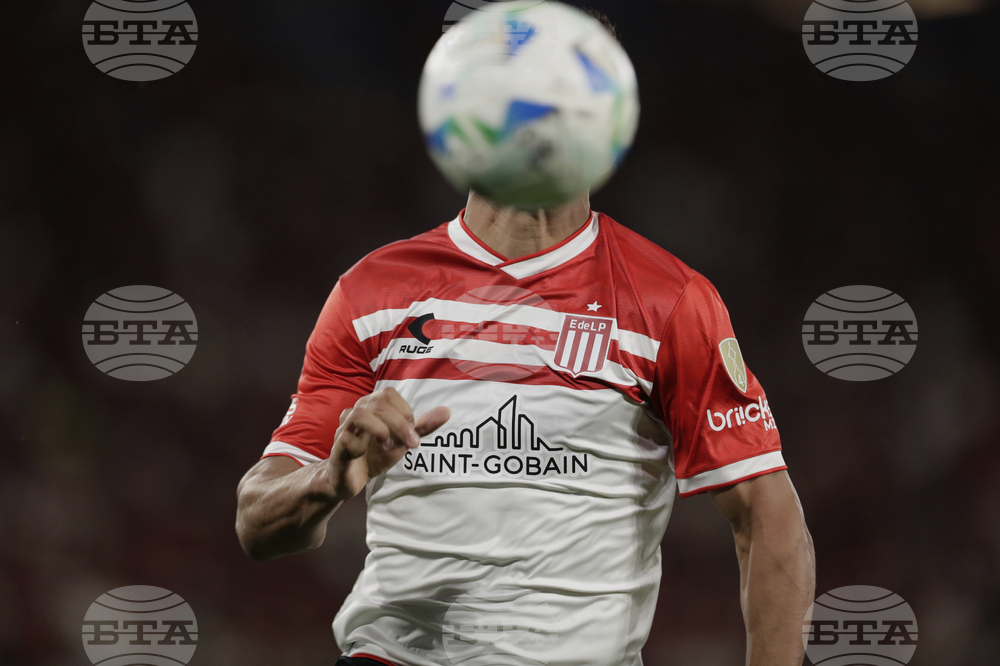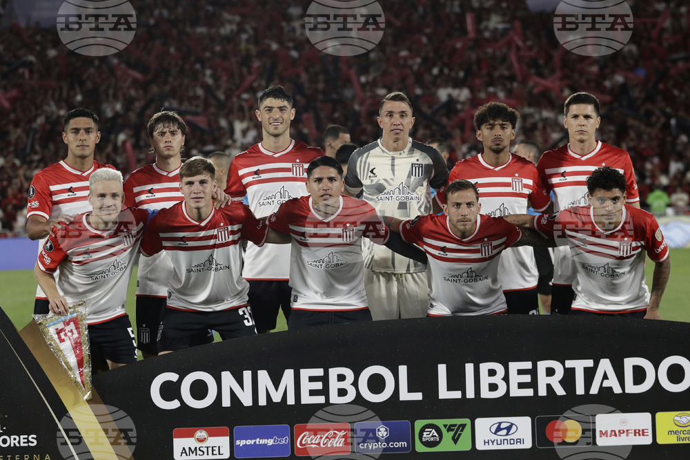 Players of Argentina's Estudiantes de La Plata pose for a team photo prior to a Copa Libertadores quarterfinal soccer match against Brazil's Flamengo at Maracana stadium, in Rio de Janeiro, Thursday, Sept. 18, 2025. (AP Photo/Bruna Prado)