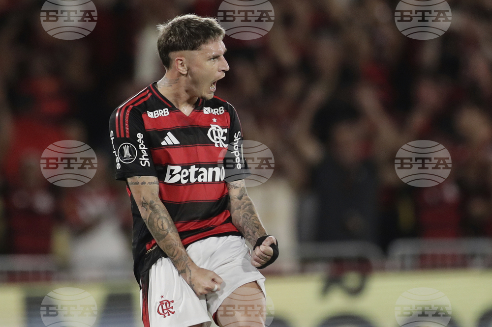 Pedro of Brazil's Flamengo celebrates scoring his side's opening goal against Argentina's Estudiantes de La Plata during a Copa Libertadores quarterfinal soccer match at Maracana stadium, in Rio de Janeiro, Thursday, Sept. 18, 2025. (AP Photo/Bruna Prado)