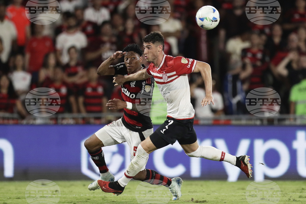 Facundo Farias of Argentina's Estudiantes de La Plata, left, controls the ball during a Copa Libertadores quarterfinal soccer match against Brazil's Flamengo at Maracana stadium, in Rio de Janeiro, Thursday, Sept. 18, 2025. (AP Photo/Bruna Prado)