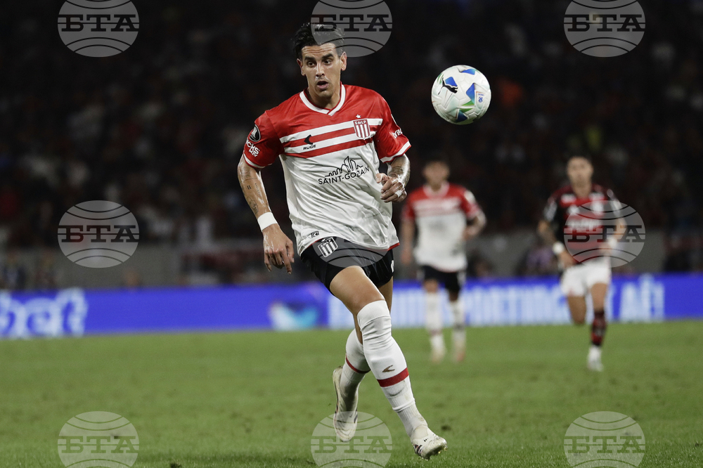 Alexis Castro of Argentina's Estudiantes de La Plata controls the ball during a Copa Libertadores quarterfinal soccer match against Brazil's Flamengo at Maracana stadium, in Rio de Janeiro, Thursday, Sept. 18, 2025. (AP Photo/Bruna Prado)