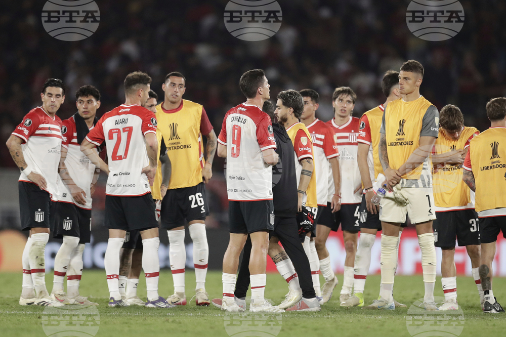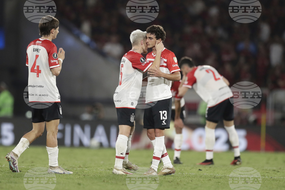 Players of Argentina's Estudiantes de La Plata reacts after losing 1-2 against Brazil's Flamengo at the end of a Copa Libertadores quarterfinal soccer match at Maracana stadium, in Rio de Janeiro, Thursday, Sept. 18, 2025. (AP Photo/Bruna Prado)