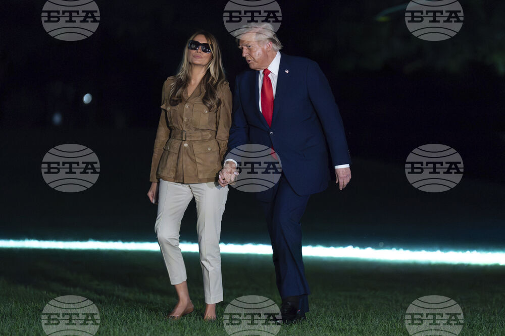 President Donald Trump holds hands with first lady Melania Trump as they walk on the South Lawn upon their arrival to the White House, in Washington, Thursday, Sept. 18, 2025. (AP Photo/Jose Luis Magana)