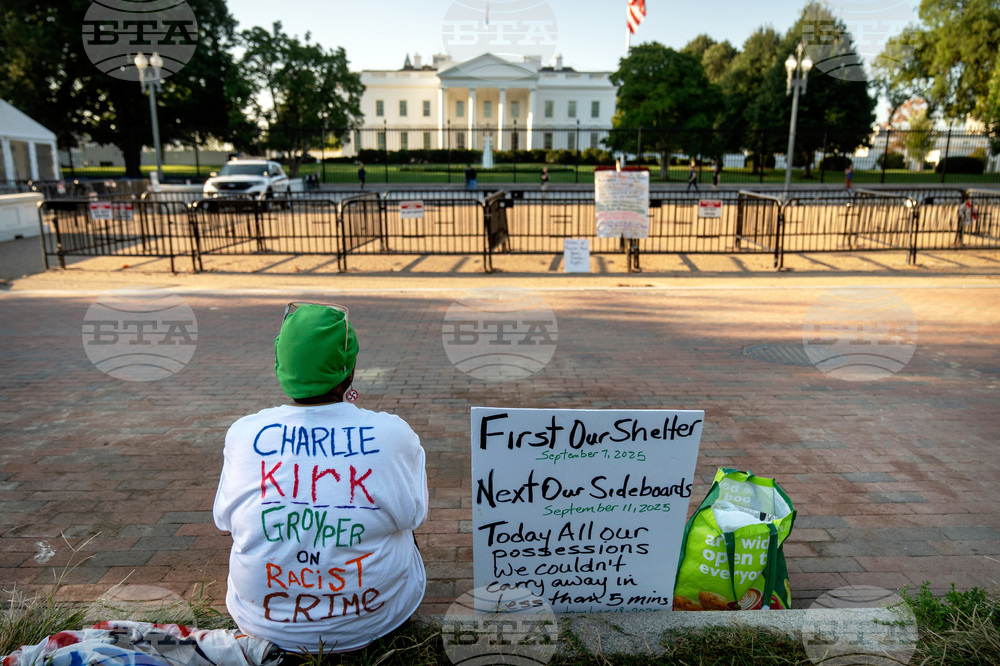 Nadine Siler of Waldorf, Md., sits on the site of a long-running protest vigil across from the White House, which was removed by officials on Thursday night, shown Friday morning, Sept. 19, 2025, in Washington. (AP Photo/Mark Schiefelbein)