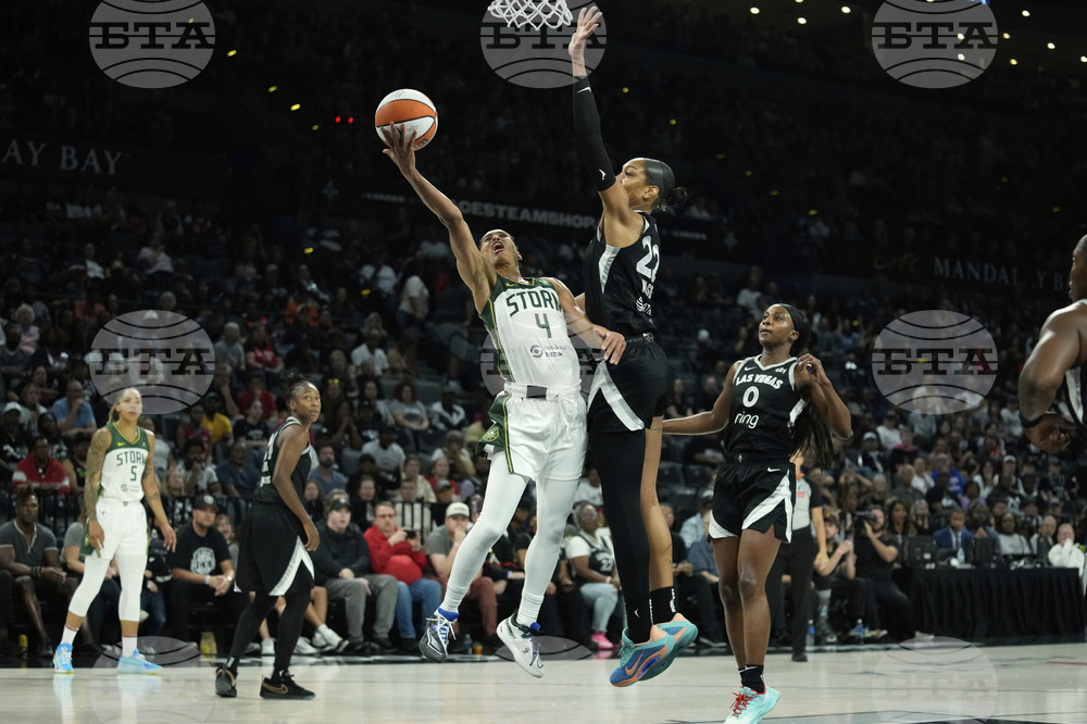 Seattle Storm guard Skylar Diggins (4) shoots around Las Vegas Aces center A'ja Wilson (22) during the first half of Game 3 in the first round of the WNBA basketball playoffs Thursday, Sept. 18, 2025, in Las Vegas. (AP Photo/John Locher)