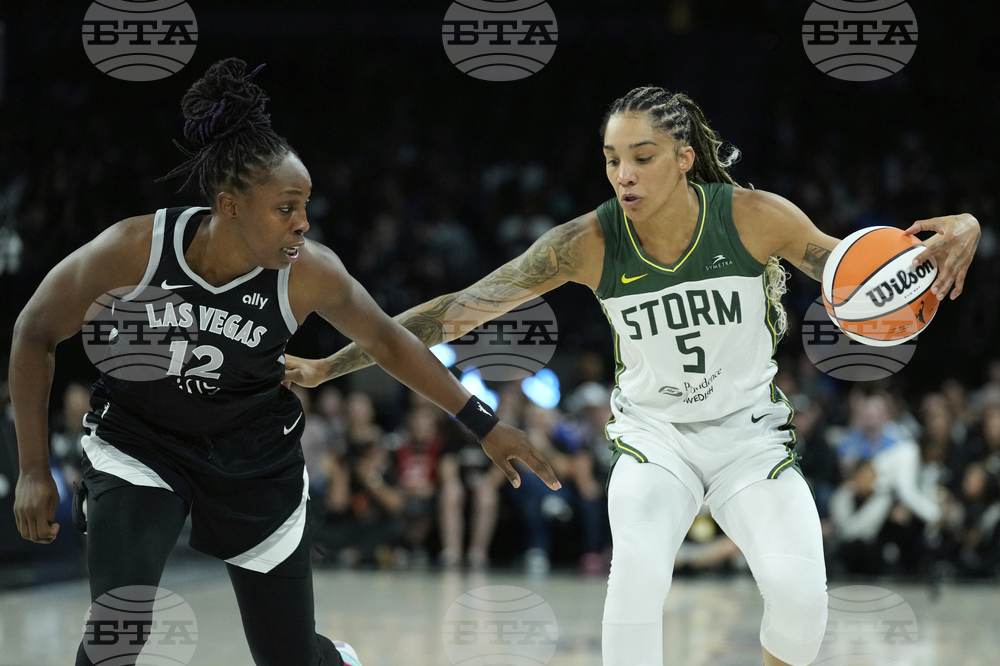 Seattle Storm forward Gabby Williams (5) drives against Las Vegas Aces guard Chelsea Gray (12) during the first half of Game 3 in the first round of the WNBA basketball playoffs Thursday, Sept. 18, 2025, in Las Vegas. (AP Photo/John Locher)