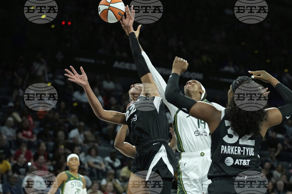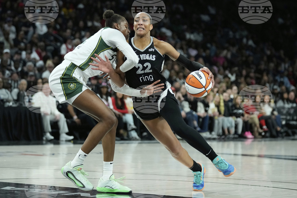 Las Vegas Aces center A'ja Wilson (22) and Seattle Storm forward Ezi Magbegor (13) battle for the ball during the second half of Game 3 in the first round of the WNBA basketball playoffs Thursday, Sept. 18, 2025, in Las Vegas. (AP Photo/John Locher)